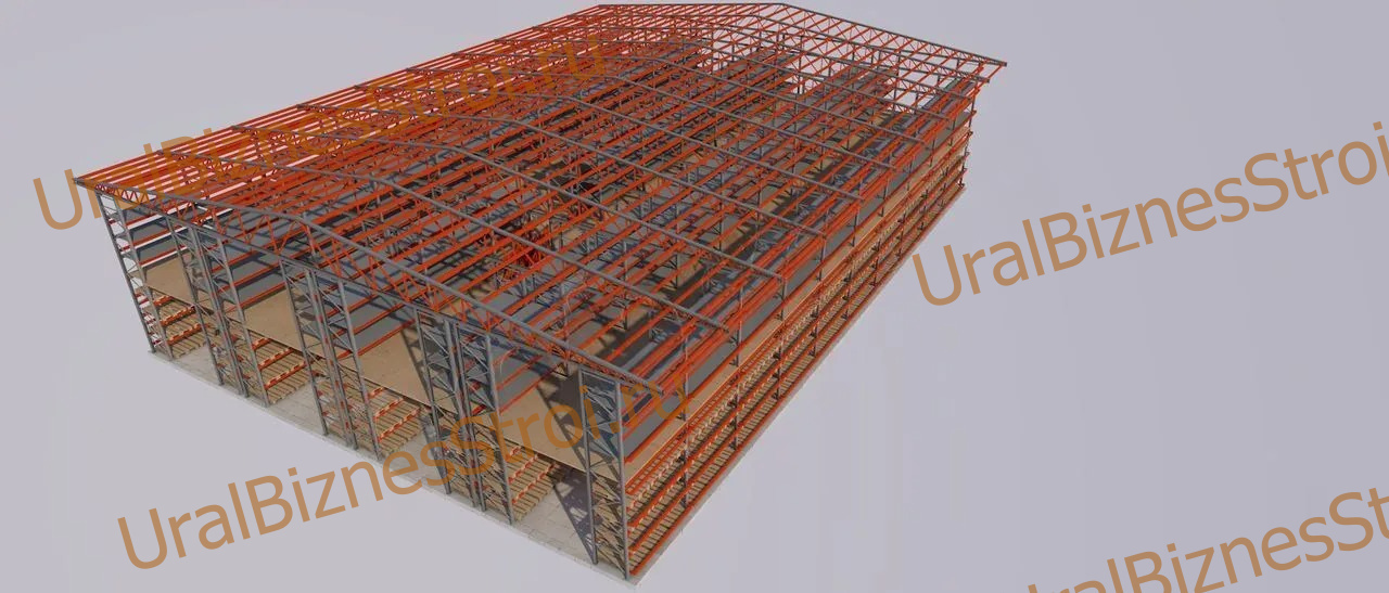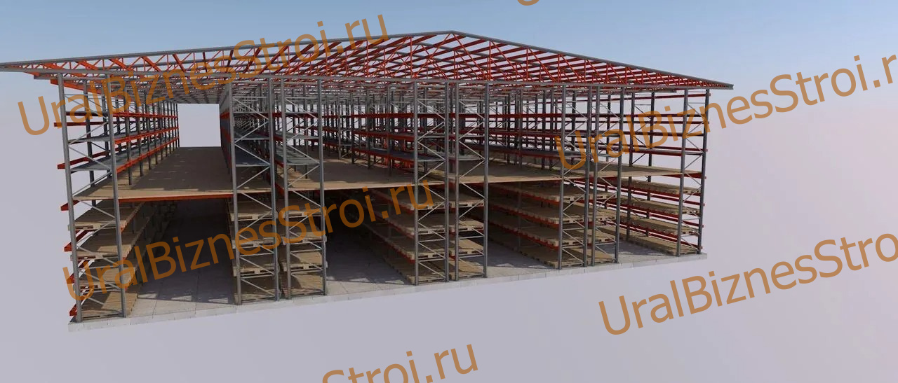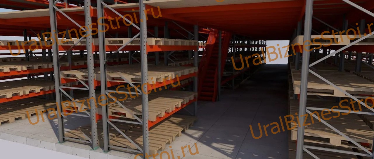 Быстровозводимый склад (мезонин) на паллетных стеллажах 20000*27000*10000 2 этажа, под две наклонные фермы