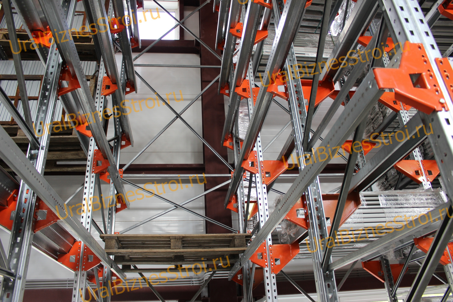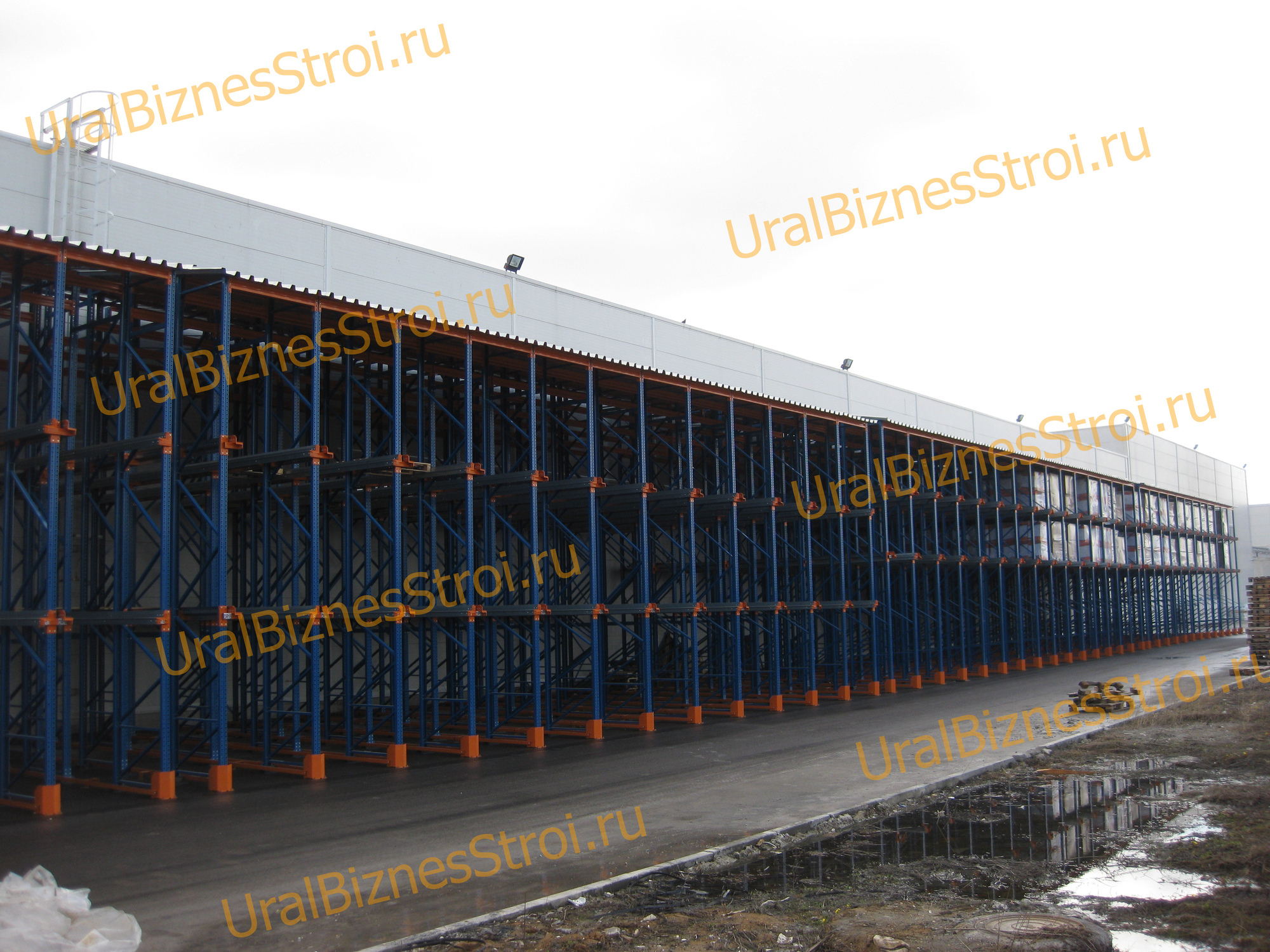 Каркас стеллажей выполнен из стальных стоек, обеспечивающих надежность и легкость конструкции. Крыша монтируется на стропильные фермы, а далее крепится крыша с кровлей. Для соединения элементов используются болты и зацепы, без сварных швов. Ворота склада можно сделать распашными, откатными, подъемными.