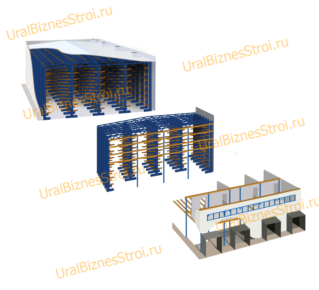 Каркас стеллажей выполнен из стальных стоек, обеспечивающих надежность и легкость конструкции. Крыша монтируется на стропильные фермы, а далее крепится крыша с кровлей. Для соединения элементов используются болты и зацепы, без сварных швов. Ворота склада можно сделать распашными, откатными, подъемными.