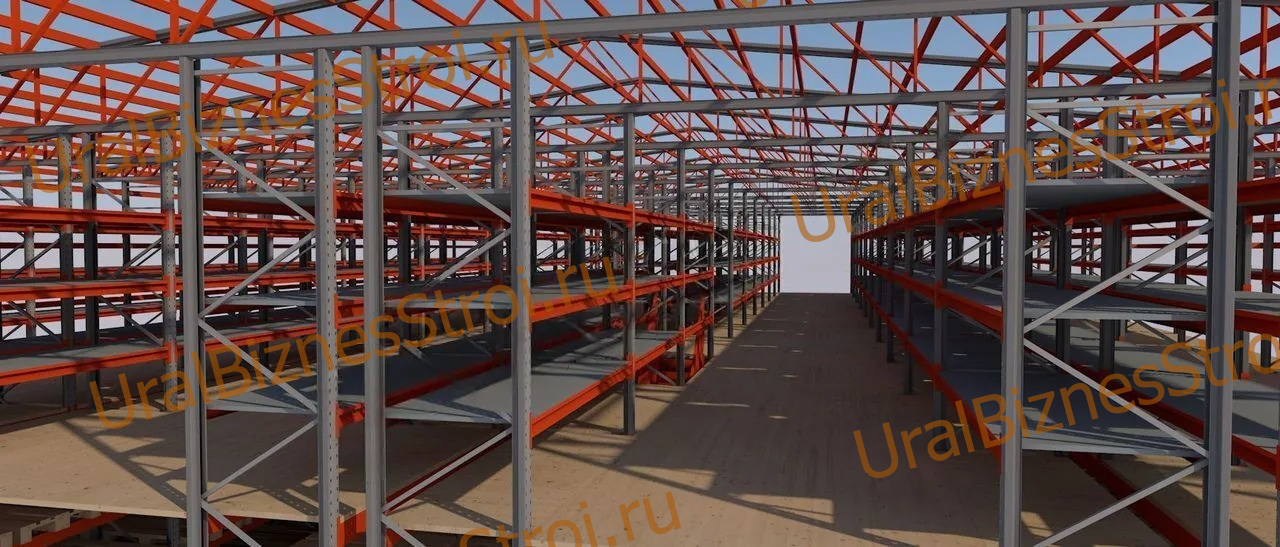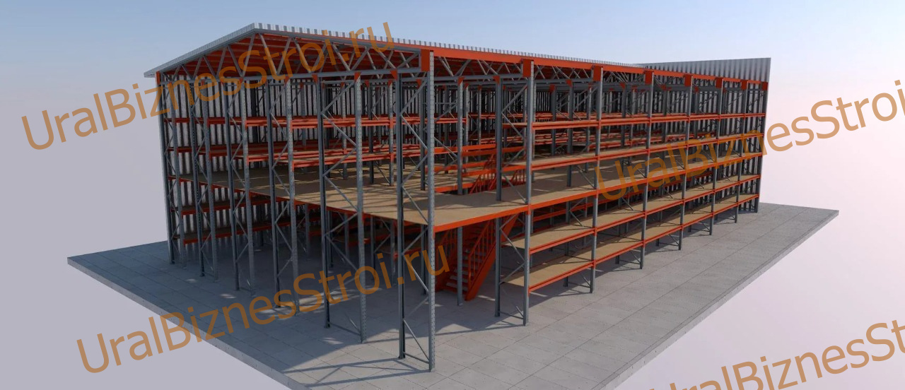 Самонесущий склад (Мезонин) на паллетных стеллажах 12000х20000*8000мм 2 этажа. Под две наклонные фермы. (Каркас)